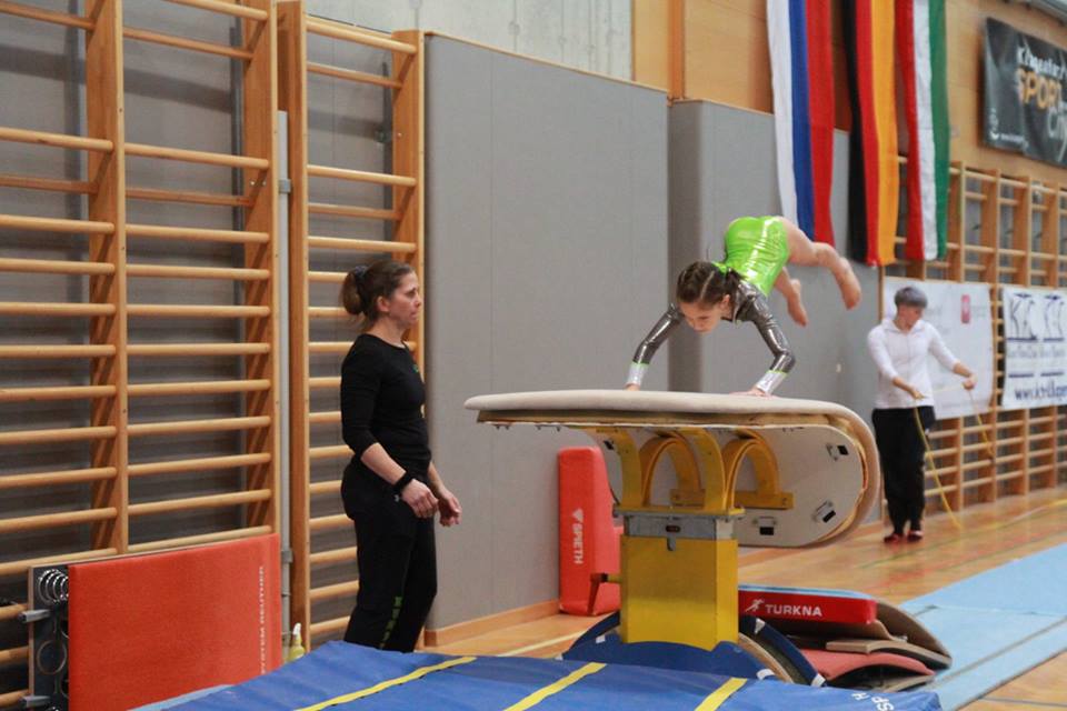 Unsere fleißige Fidschi, die erst 8 Monate dabei ist, bemühte sich sehr, war jedoch vom Pech verfolgt. Am Boden begann der Wettkampf noch mit einer tollen Übung und 11,8 Punkte (7. Platz). Dann folgte der Sprung. Salto vw. gelang ihr recht gut, doch durch die kurze Landematte folgte ein Sturz nach vorne. Ein Punkt weg. Beim Überschlag erwischte sie den Anlauf nicht und machte ein echtes „Hoppala“ über den Kasten. Dieser Fehler kosteten ihr mindestens 5 Punkte! Stufenbarren war gut (10,3 Punkte = 13. Platz). Beim Balken sauber gearbeitet doch beim Rad, das sie im Training als einzige immer locker hinstellte, ging sie vom Balken! Schade! Wieder ein Punkt weg. Somit leider nur der 31. Platz mit 37,6 Punkten (7 Punkte mehr –> 9. Platz?)